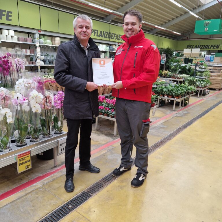 Mit großer Freude übernahm Mathias Höfer (rechts im Bild) die Urkunde von Jörg Vulturius vom Handelsverband Sachsen, die eine besondere Anerkennung für die hohe Qualität und Kundenfreundlichkeit eines Einzelhandelsunternehmens wiederspiegelt.